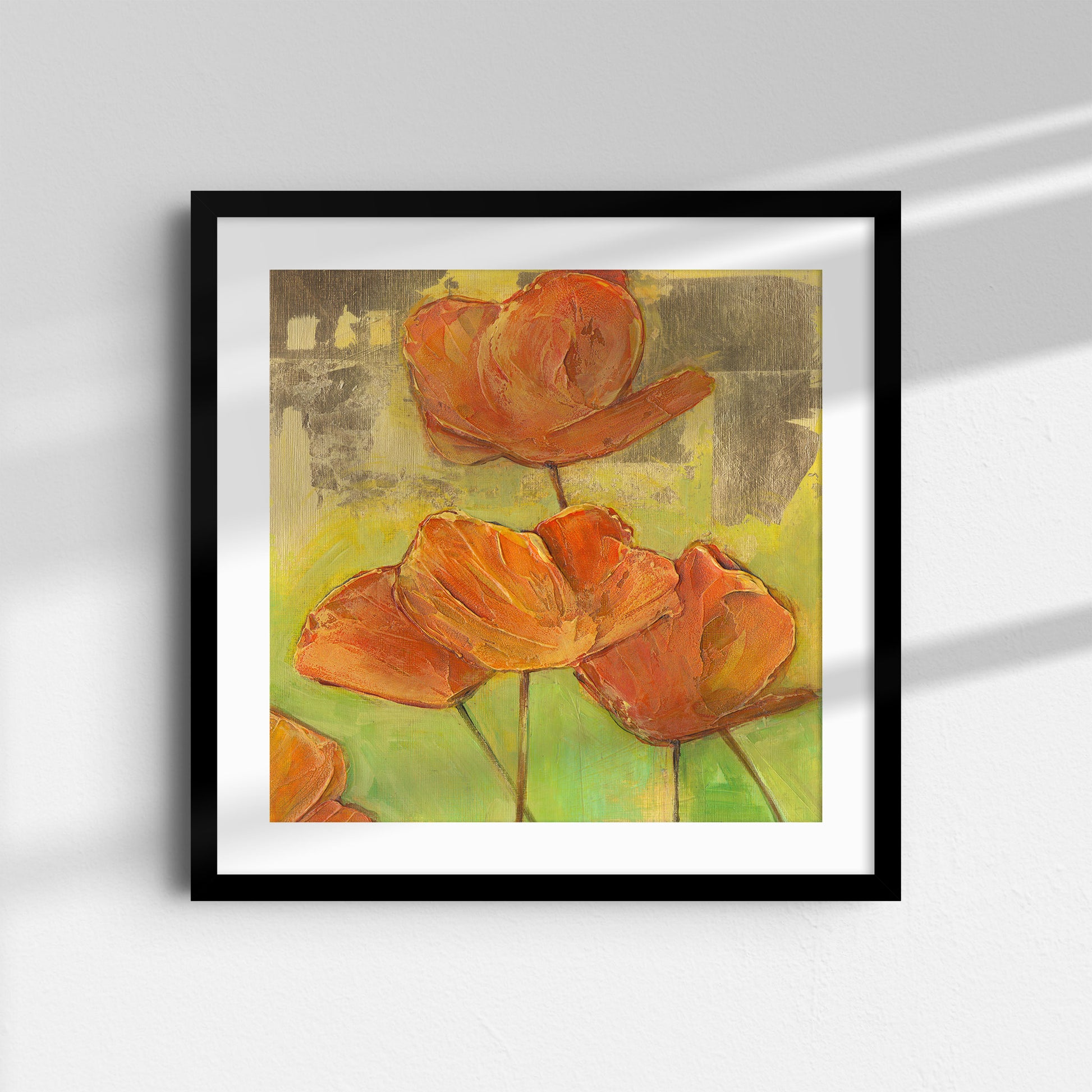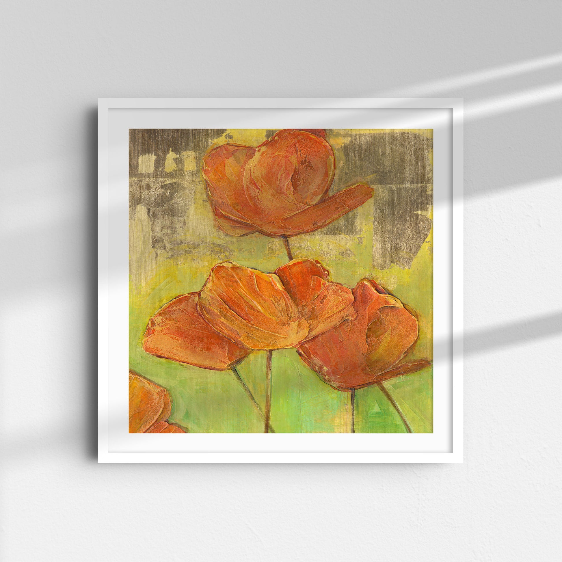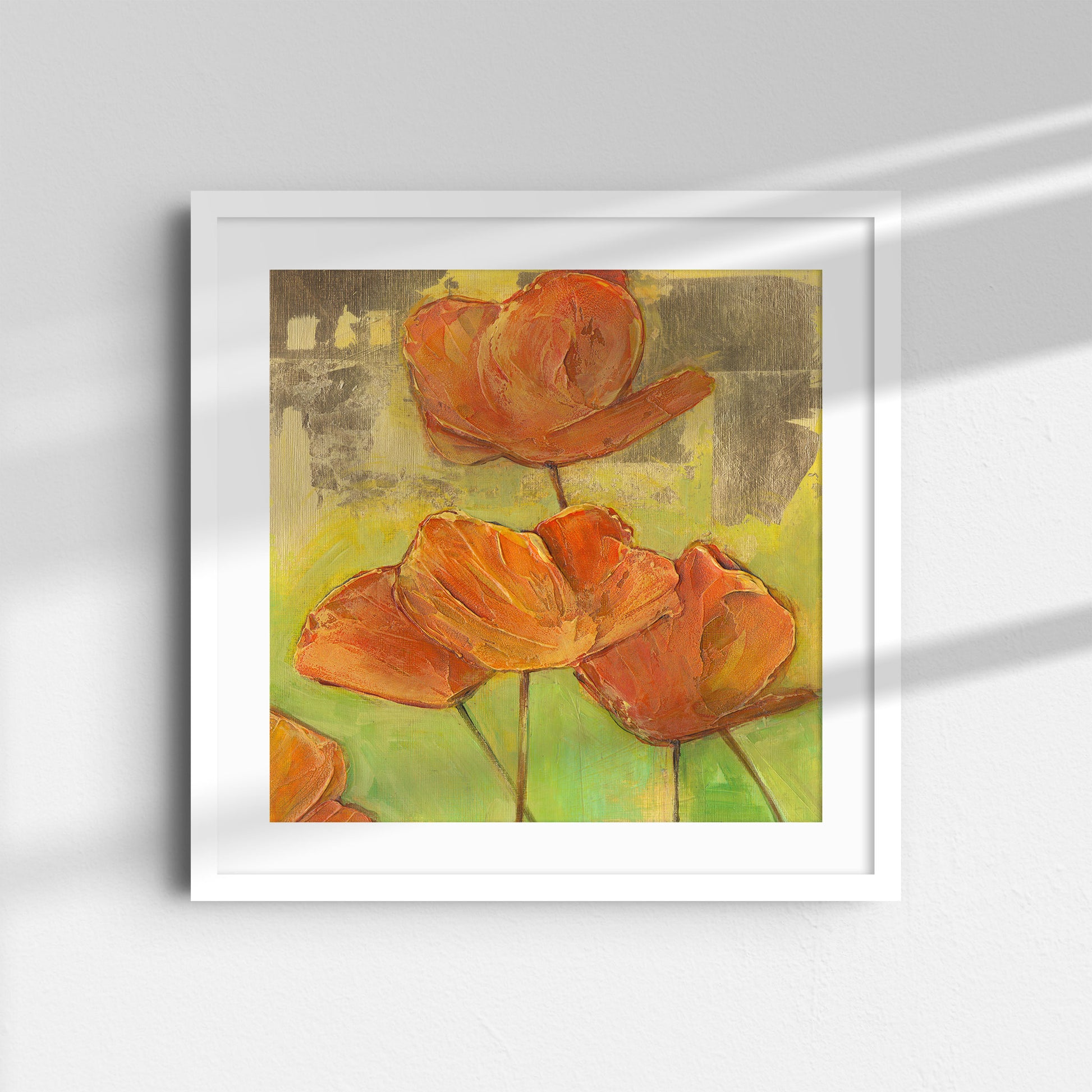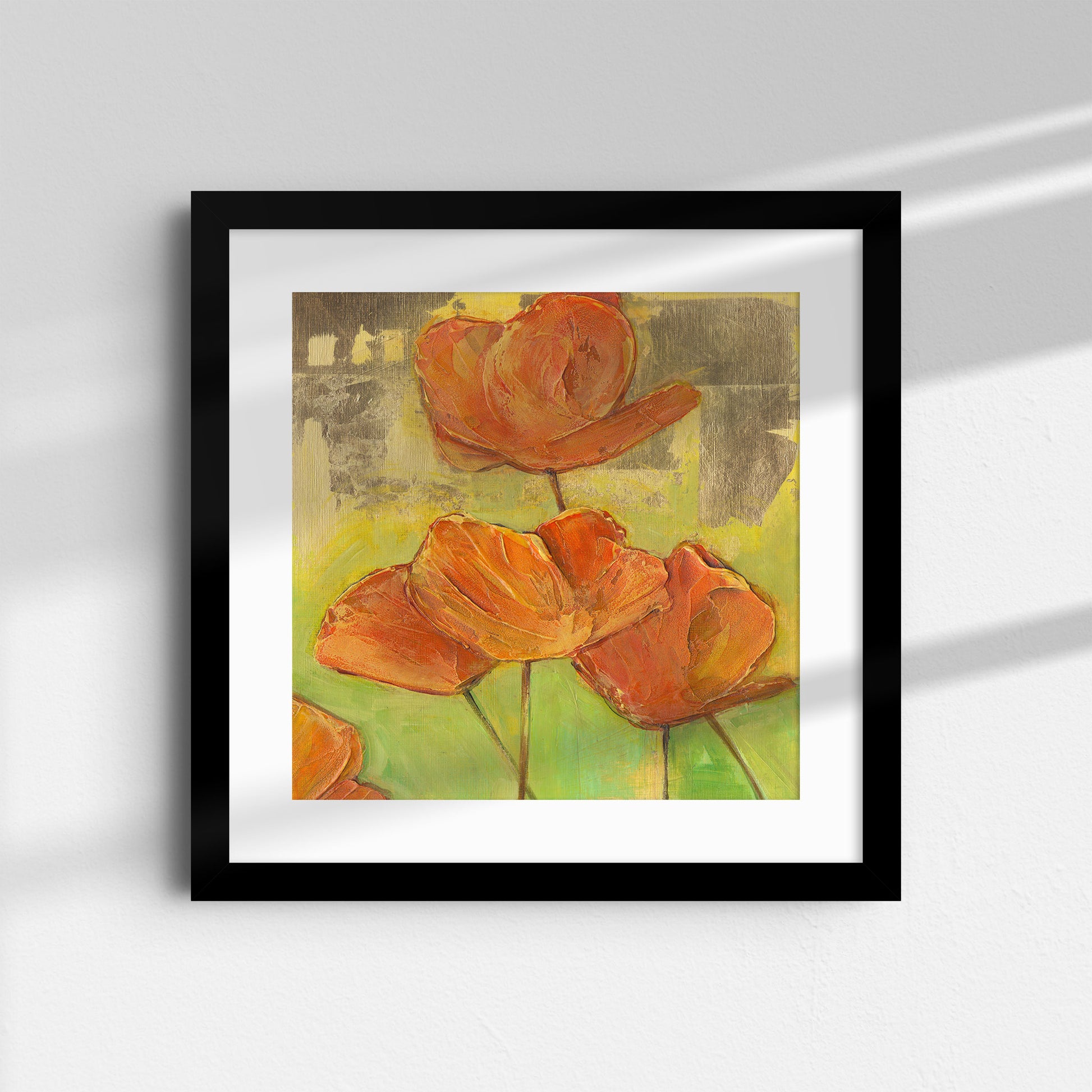 Bring the vibrant beauty of California poppies into your home with this stunning fine art print of an original acrylic painting. Featuring rich orange hues, textured brushstrokes, and a warm golden background, this piece captures the essence of wildflower landscapes in full bloom.