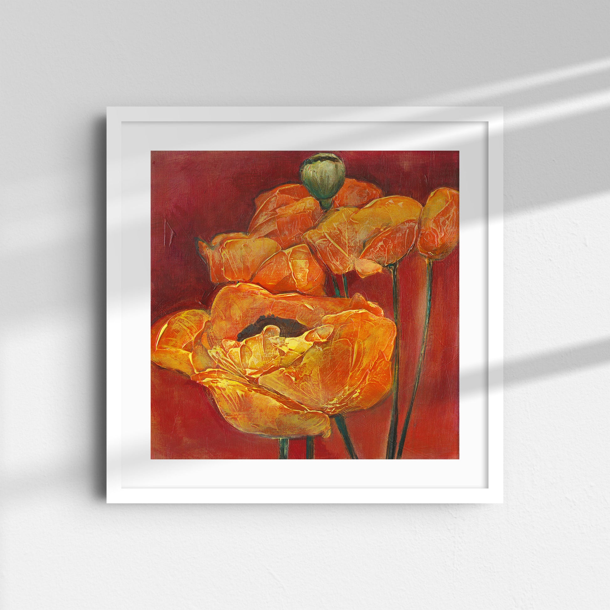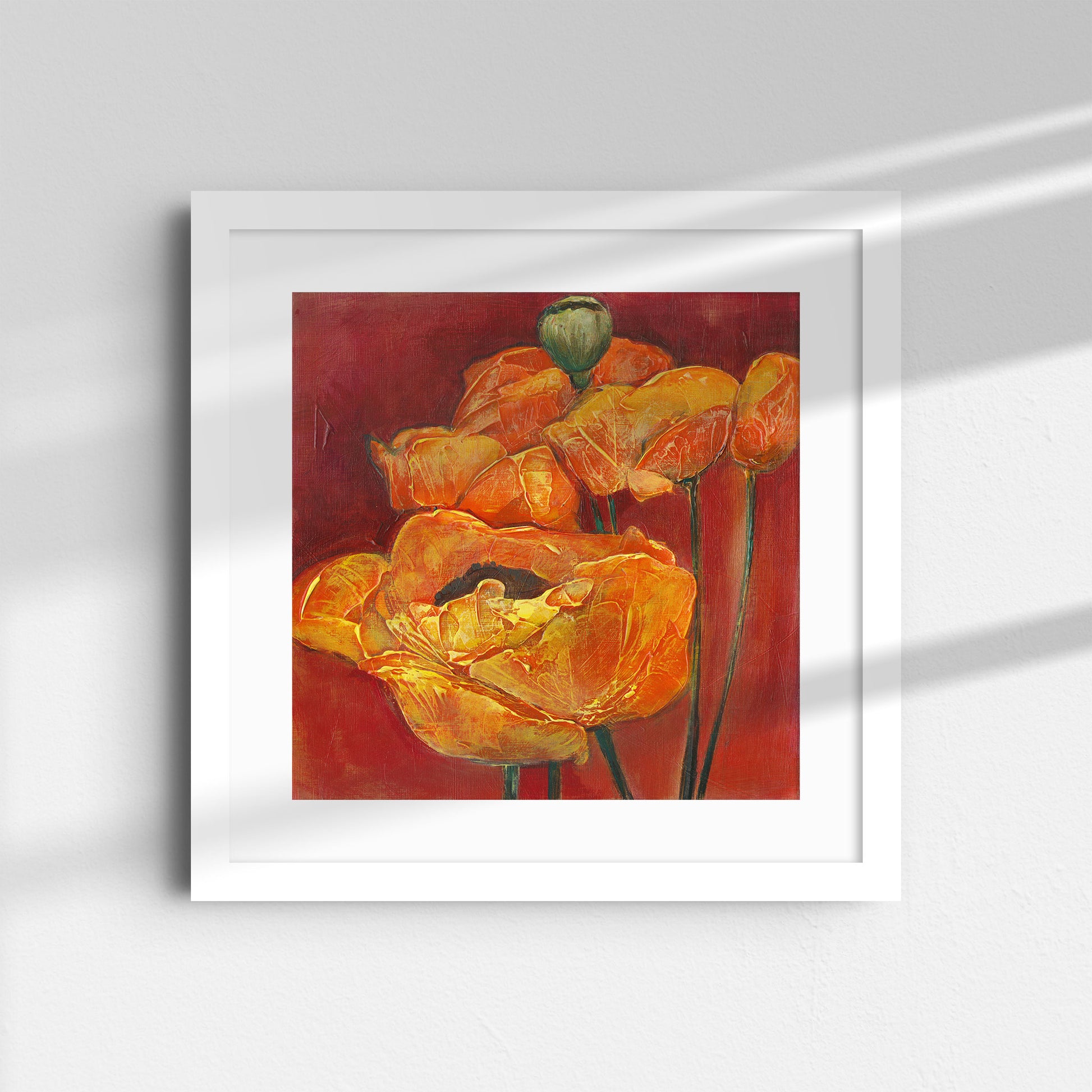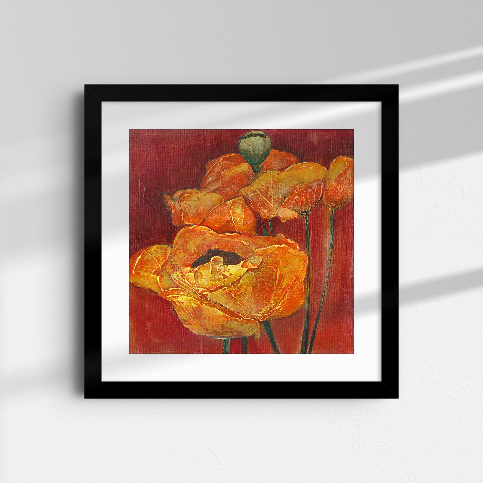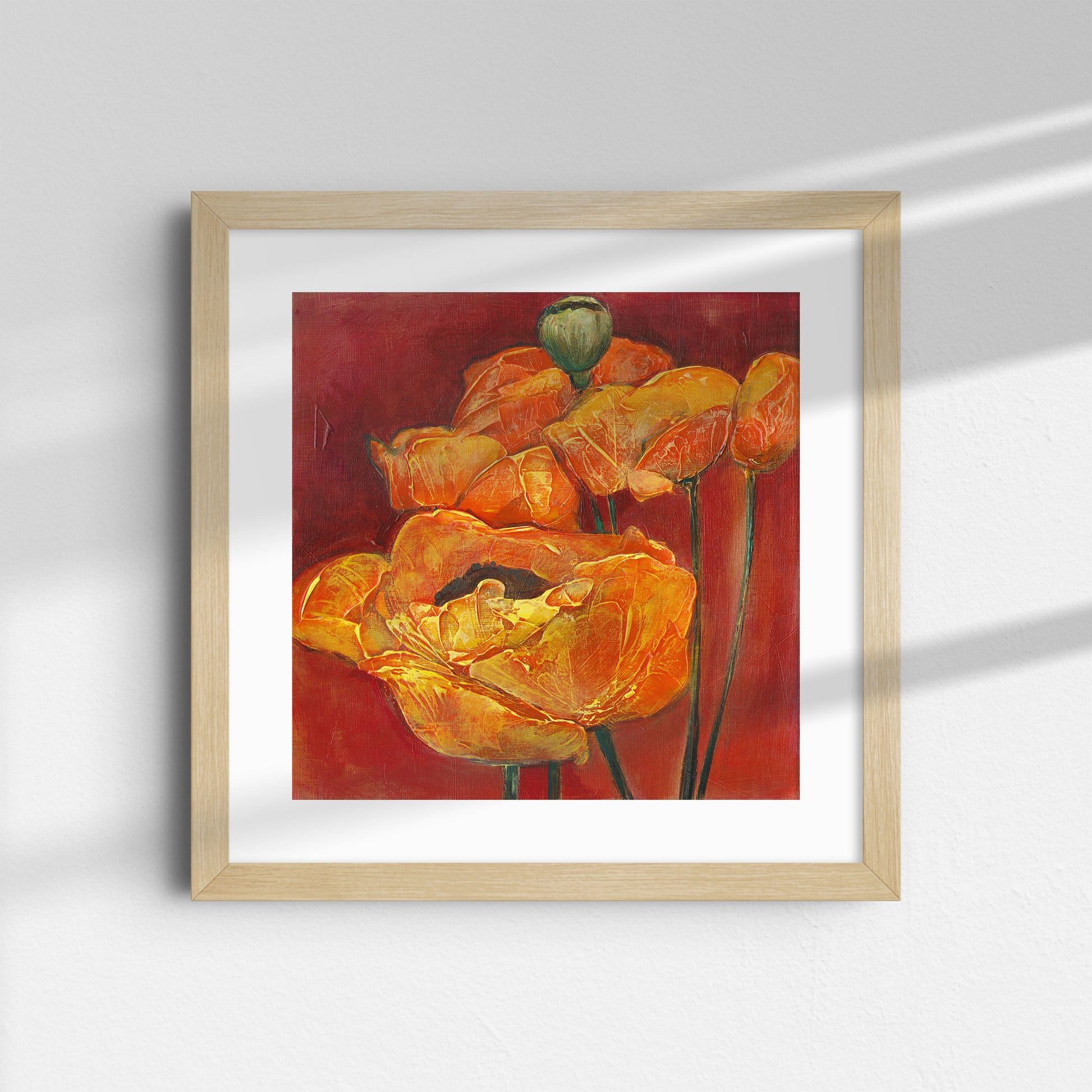 Get ready to ignite your space with fiery orange and red hues! The bold pops of color from dark brown centers and a vibrant green poppy bud will bring warmth and excitement to any room. Choose from a small or large print to make a statement and add a touch of adventure to your decor.
