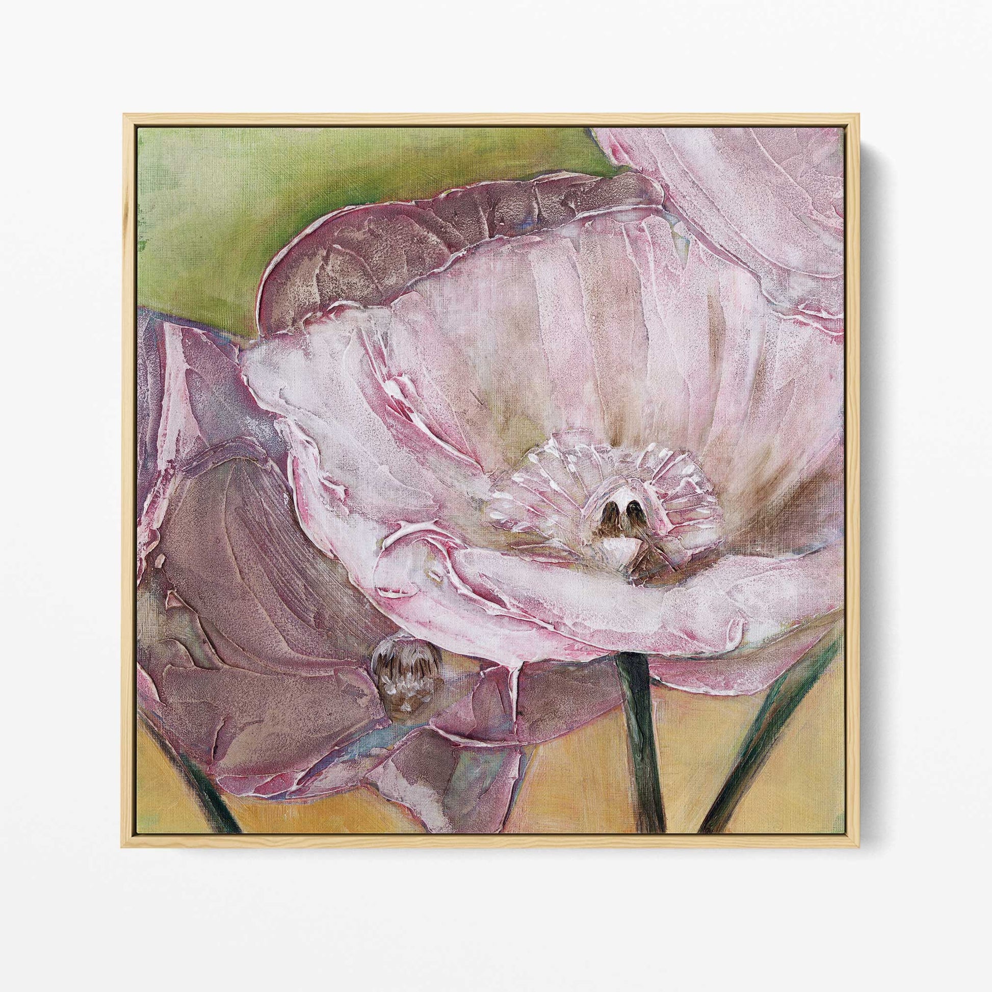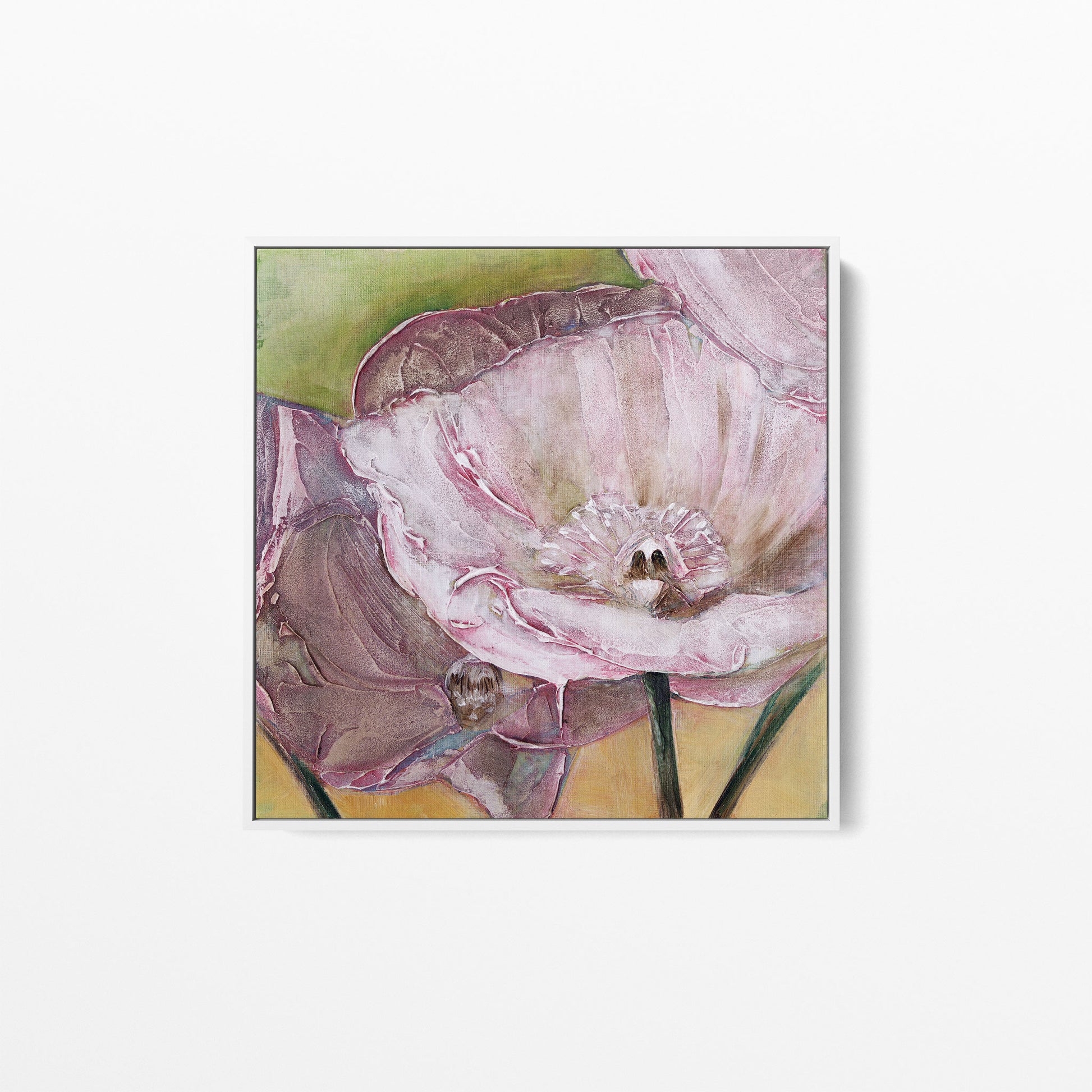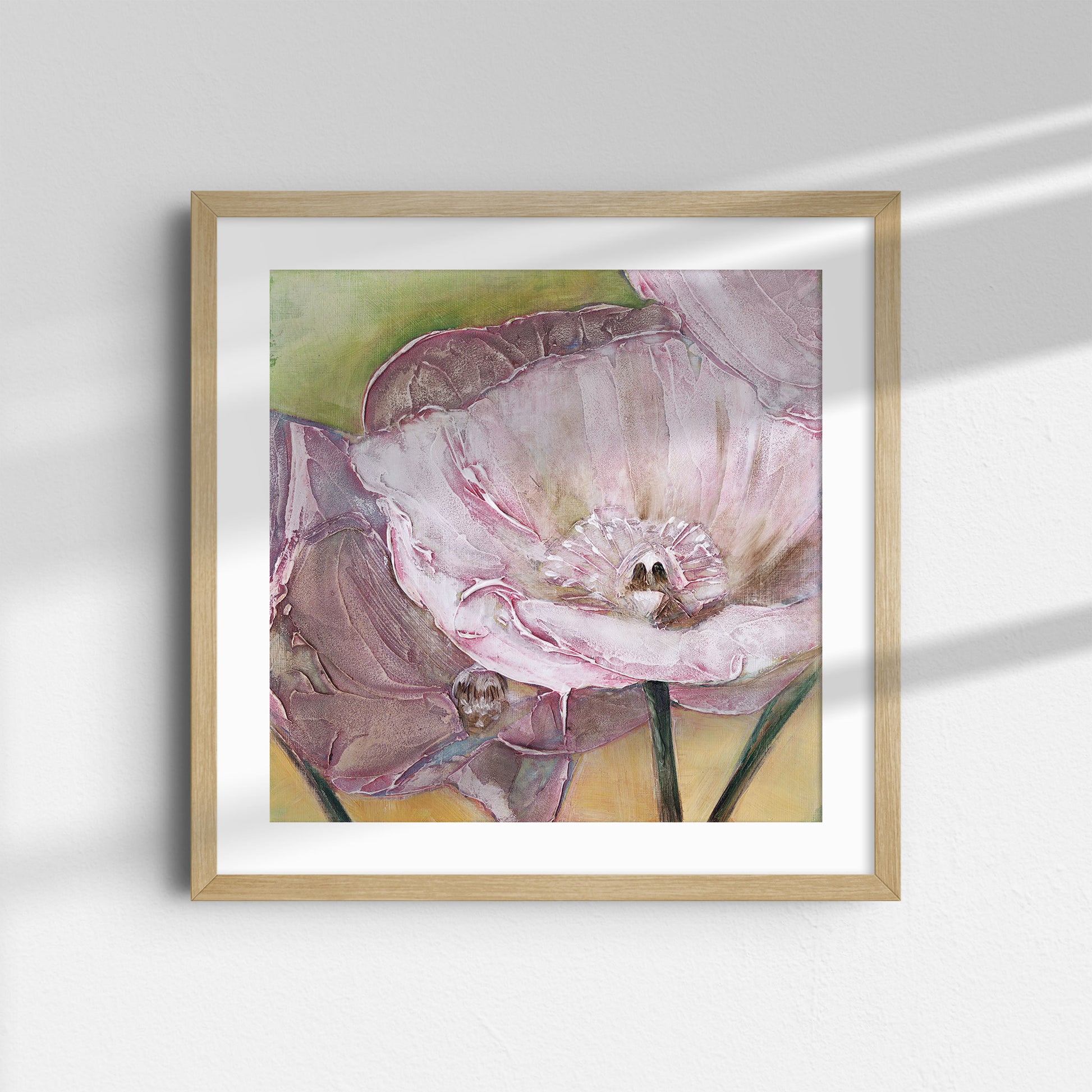 Immerse yourself in the quiet beauty of nature with "Pink Poppies Up Close", a fine art print of an original acrylic painting. This delicate piece offers an intimate view of pink poppy flowers, their textured petals unfolding gracefully against a soft green and yellow background. The composition evokes a sense of peace, stillness, and quiet joy, making it a perfect choice for those who appreciate subtle floral art.