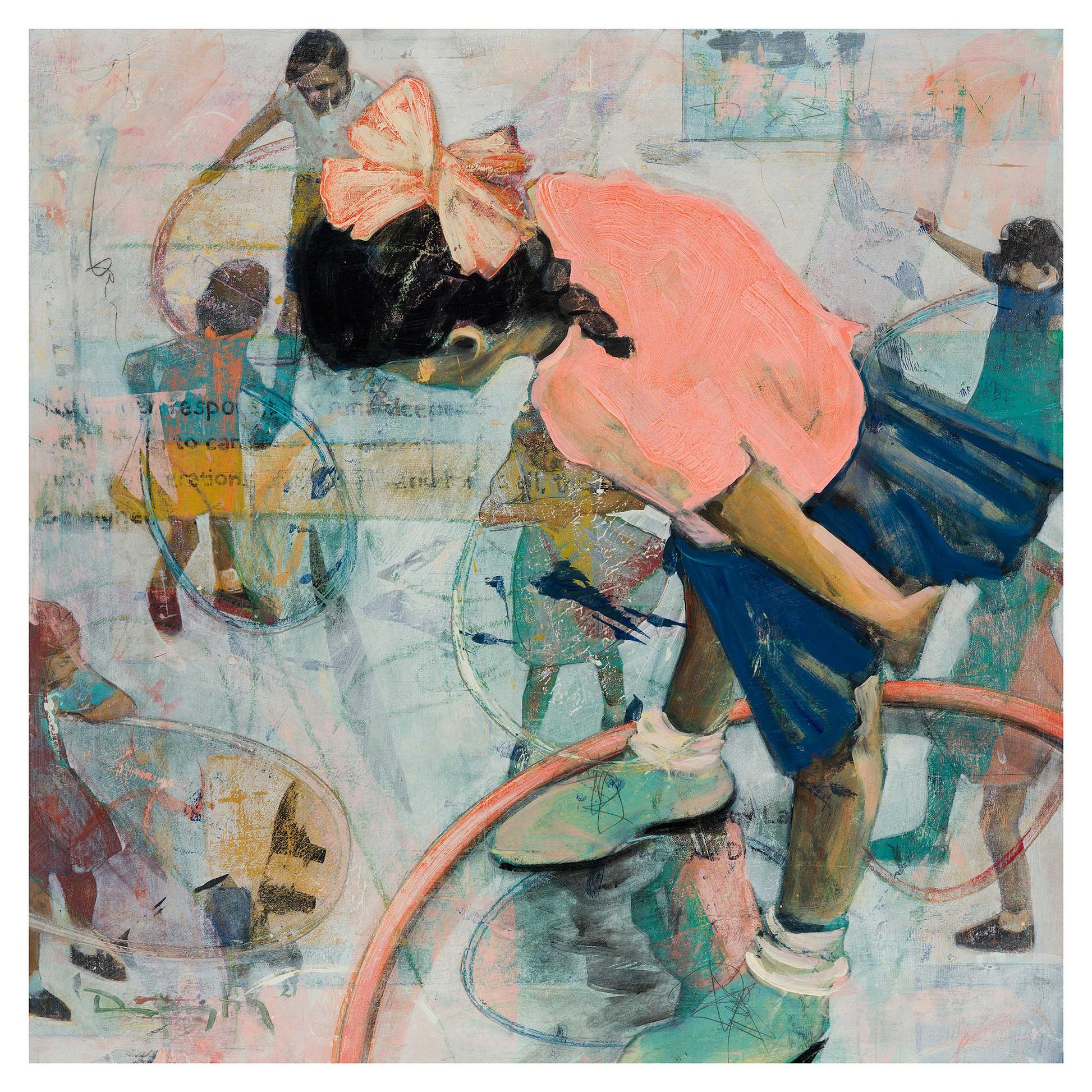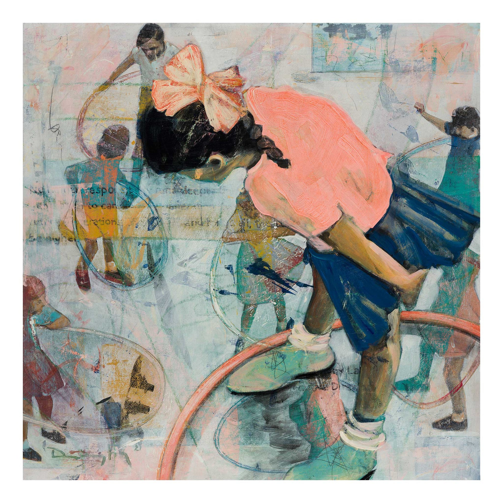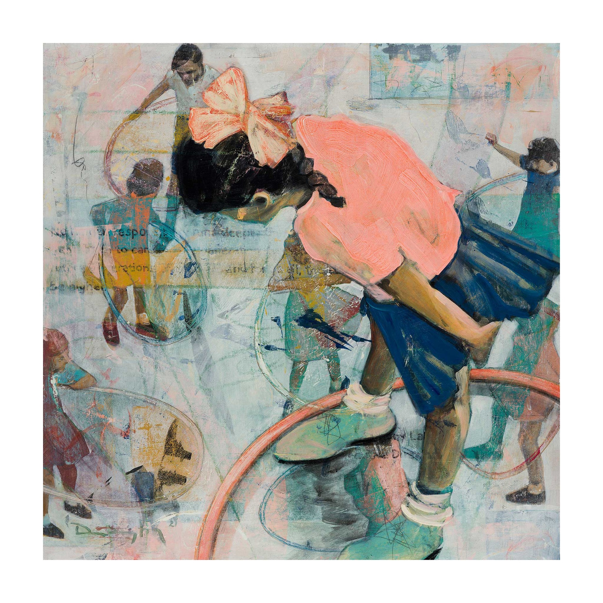 Relive the enthusiasm of childhood with "Playground Lessons,” a fine art print of an original acrylic painting. This nostalgic piece features children playing with hula hoops, with a layered, textured composition that captures movement, innocence, and the carefree spirit of youth. A central figure twirls a hula hoop, surrounded by playful energy and soft, dreamlike hues.