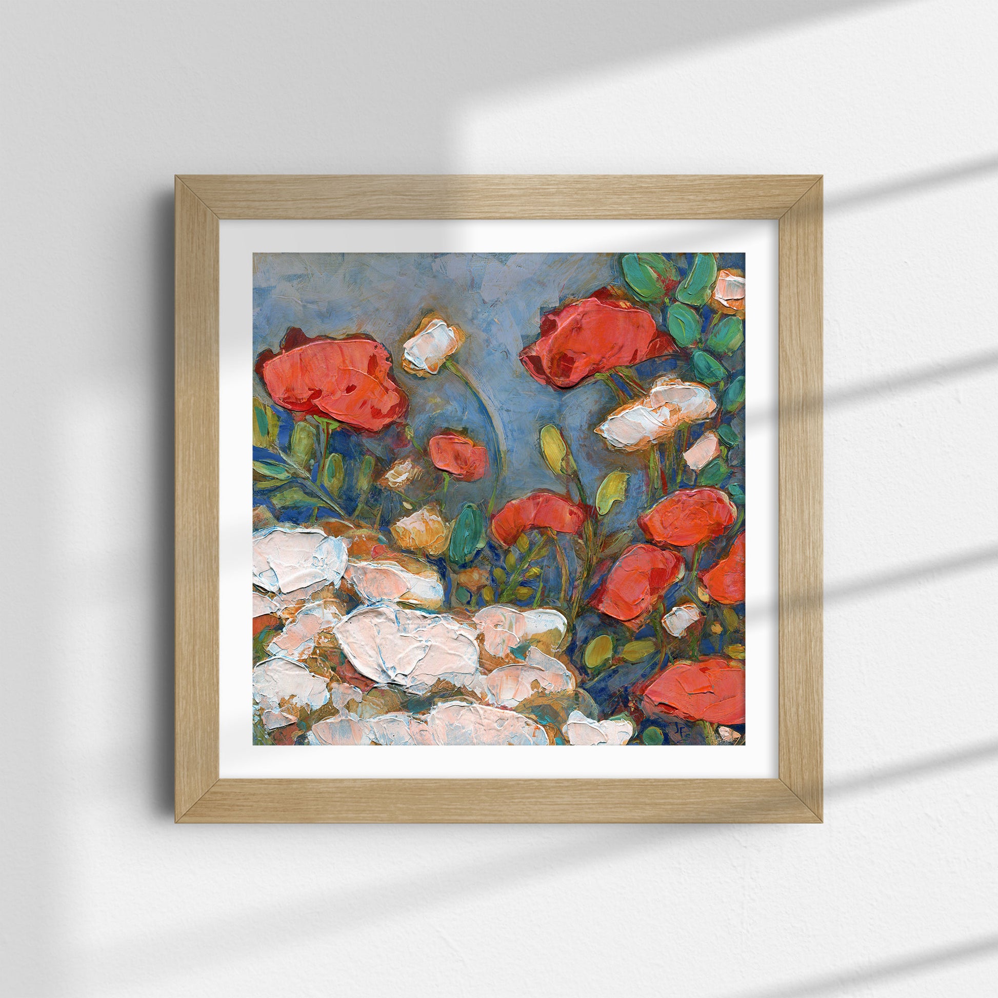 Welcome the freshness of spring with "Poppies in a Spring Garden," a print from the original 12x12 inch acrylic painting. This lively abstract floral painting features coral-orange poppies interspersed with delicate white blooms and verdant green foliage, all set against a dynamic blue background with warm undertones. Bold, impasto brushwork creates heavily textured petals and leaves that capture the vitality and movement of a garden coming to life.