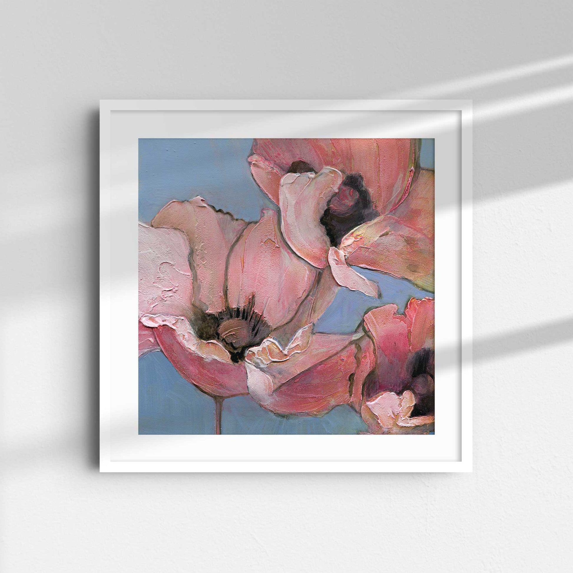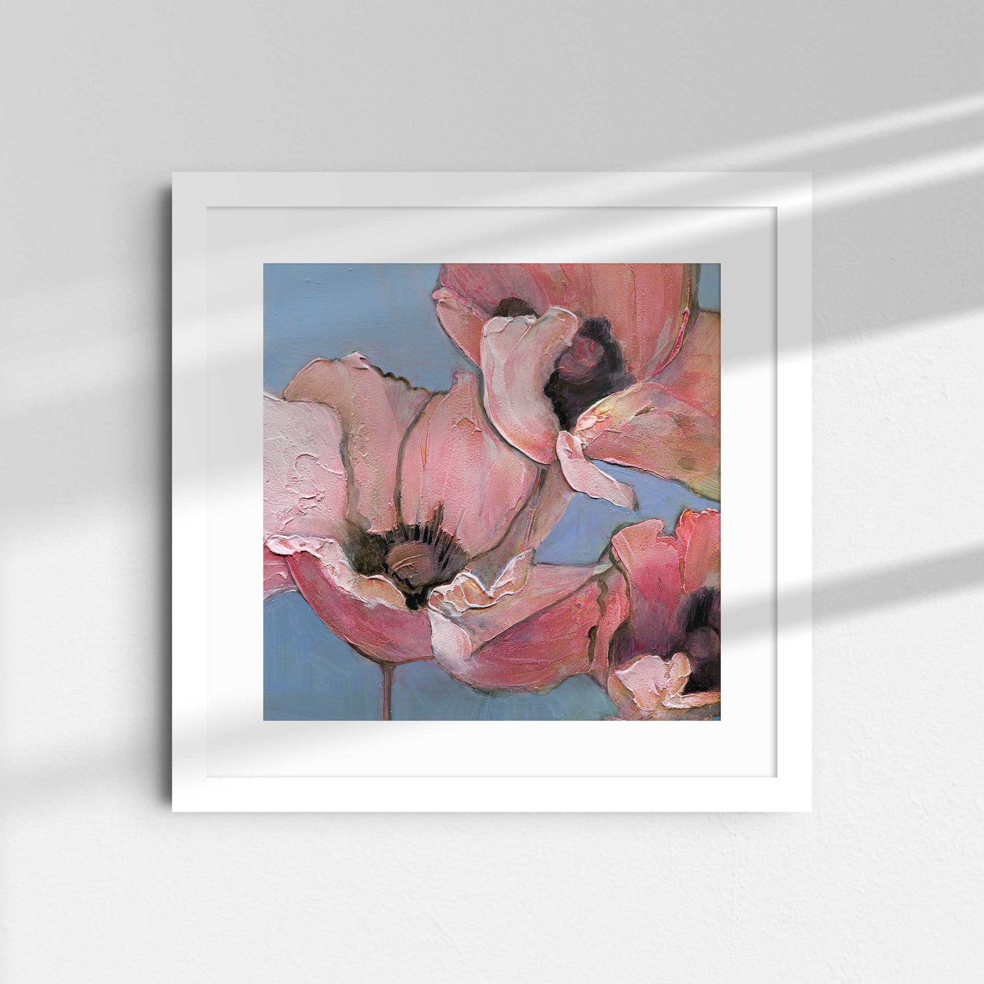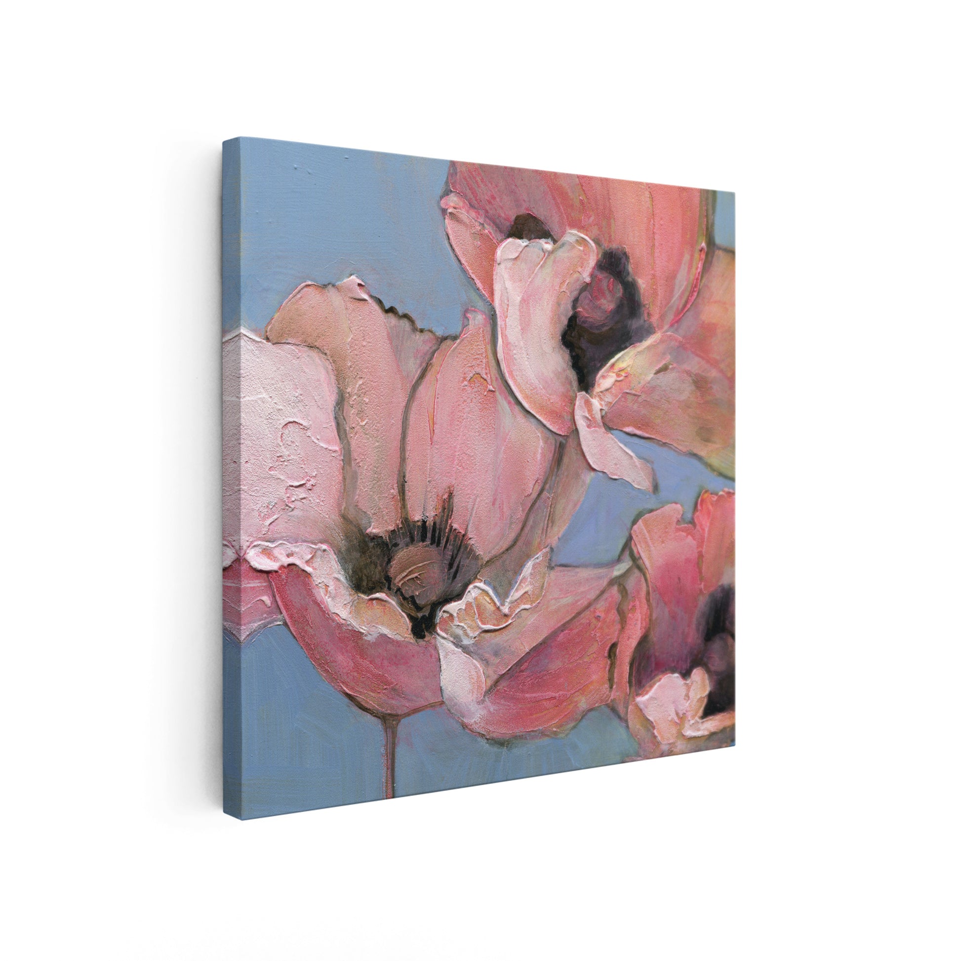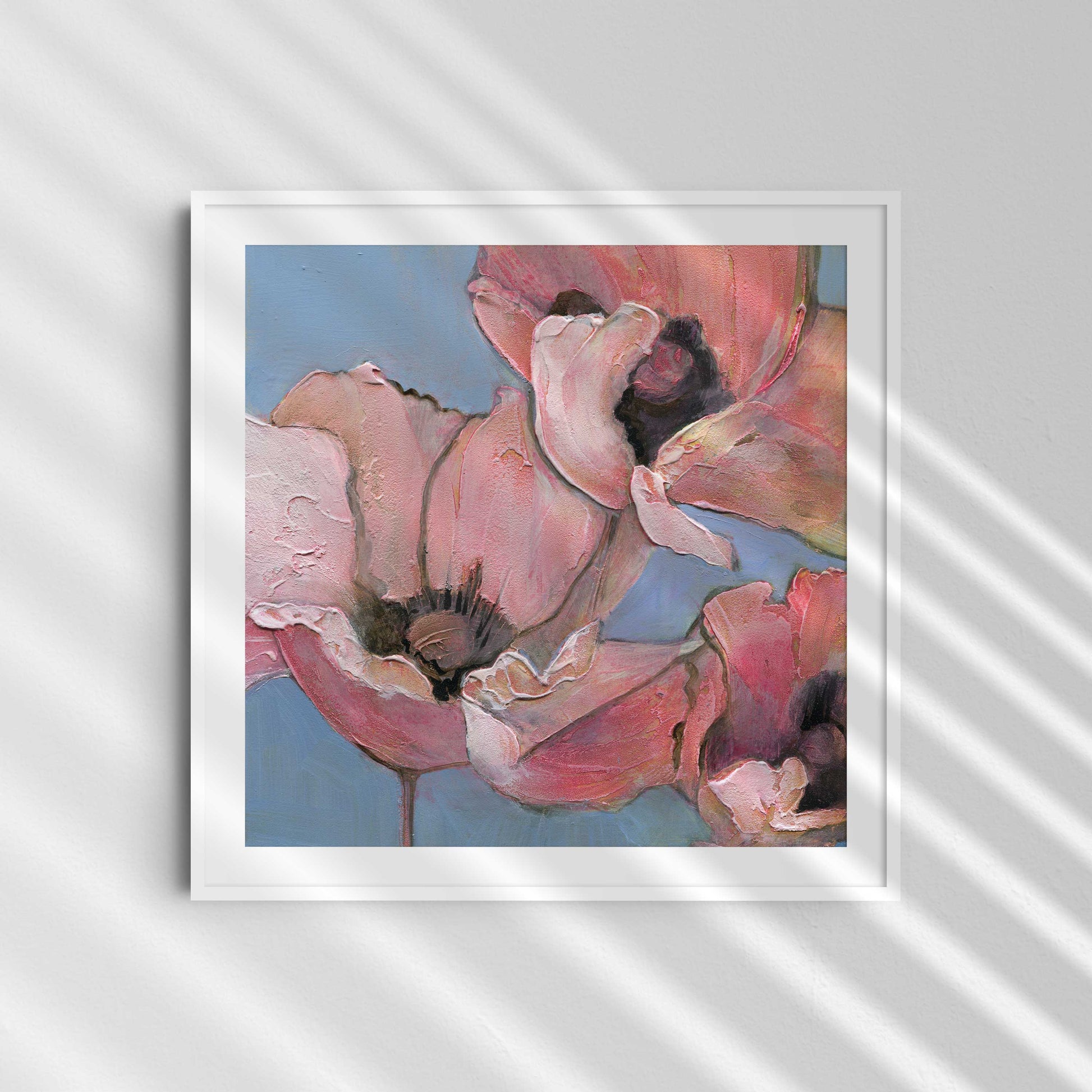Introduce softness and elegance to your space with "Poppy Portrait I", the first in a six-part series of fine art prints from the original acrylic painting, Six Poppy Portrait. This close-up features pink poppies with textured petals, set against a light blue background. Gentle brushstrokes and subtle color blending give the piece a serene, delicate, and peaceful quality, perfect for creating a calming atmosphere.
