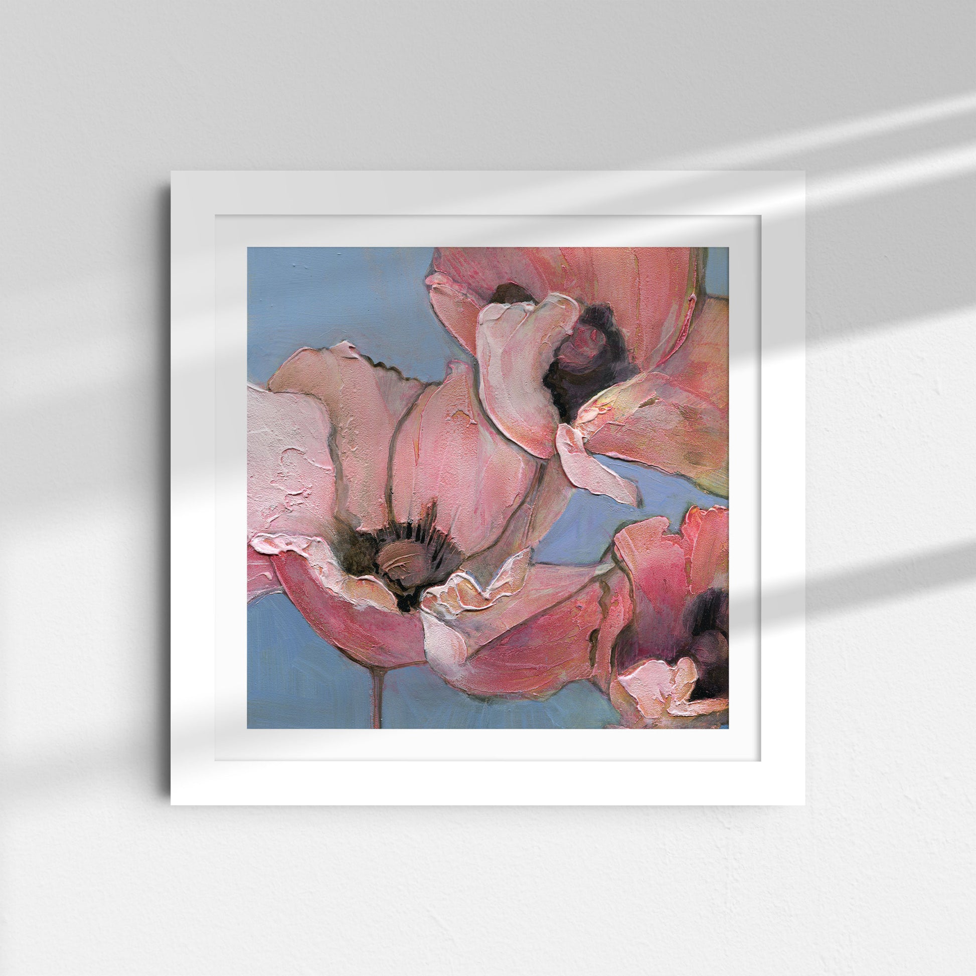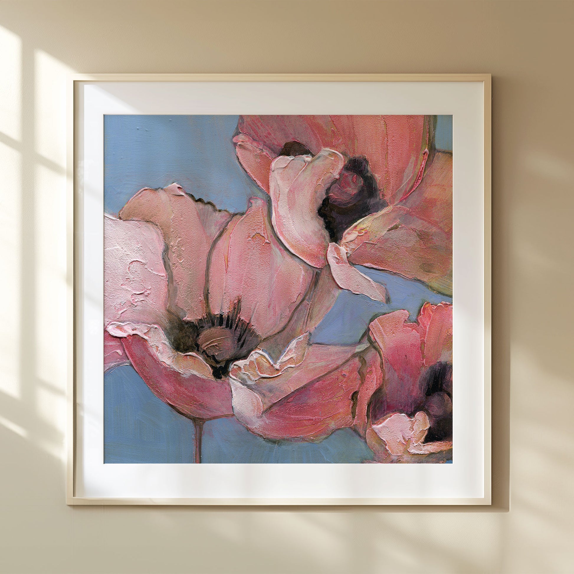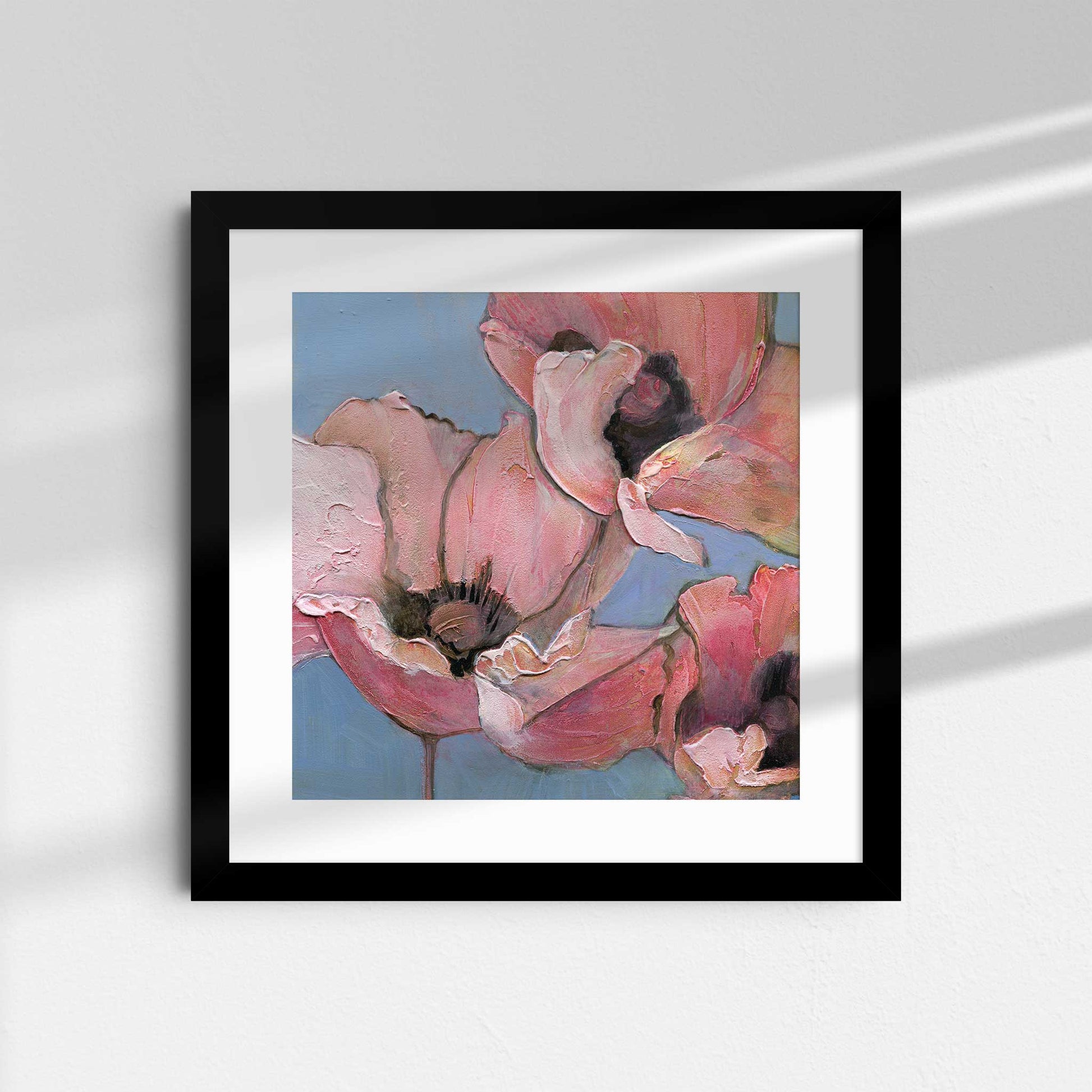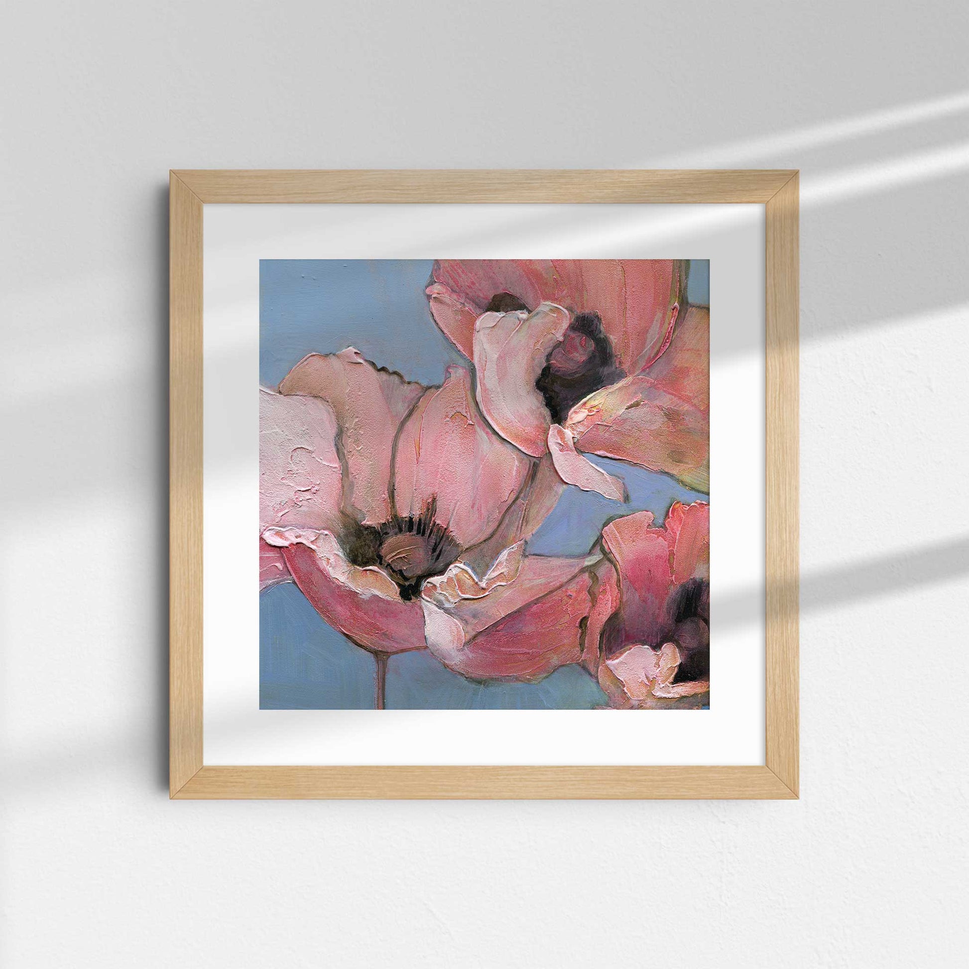 Introduce softness and elegance to your space with "Poppy Portrait I", the first in a six-part series of fine art prints from the original acrylic painting, Six Poppy Portrait. This close-up features pink poppies with textured petals, set against a light blue background. Gentle brushstrokes and subtle color blending give the piece a serene, delicate, and peaceful quality, perfect for creating a calming atmosphere.