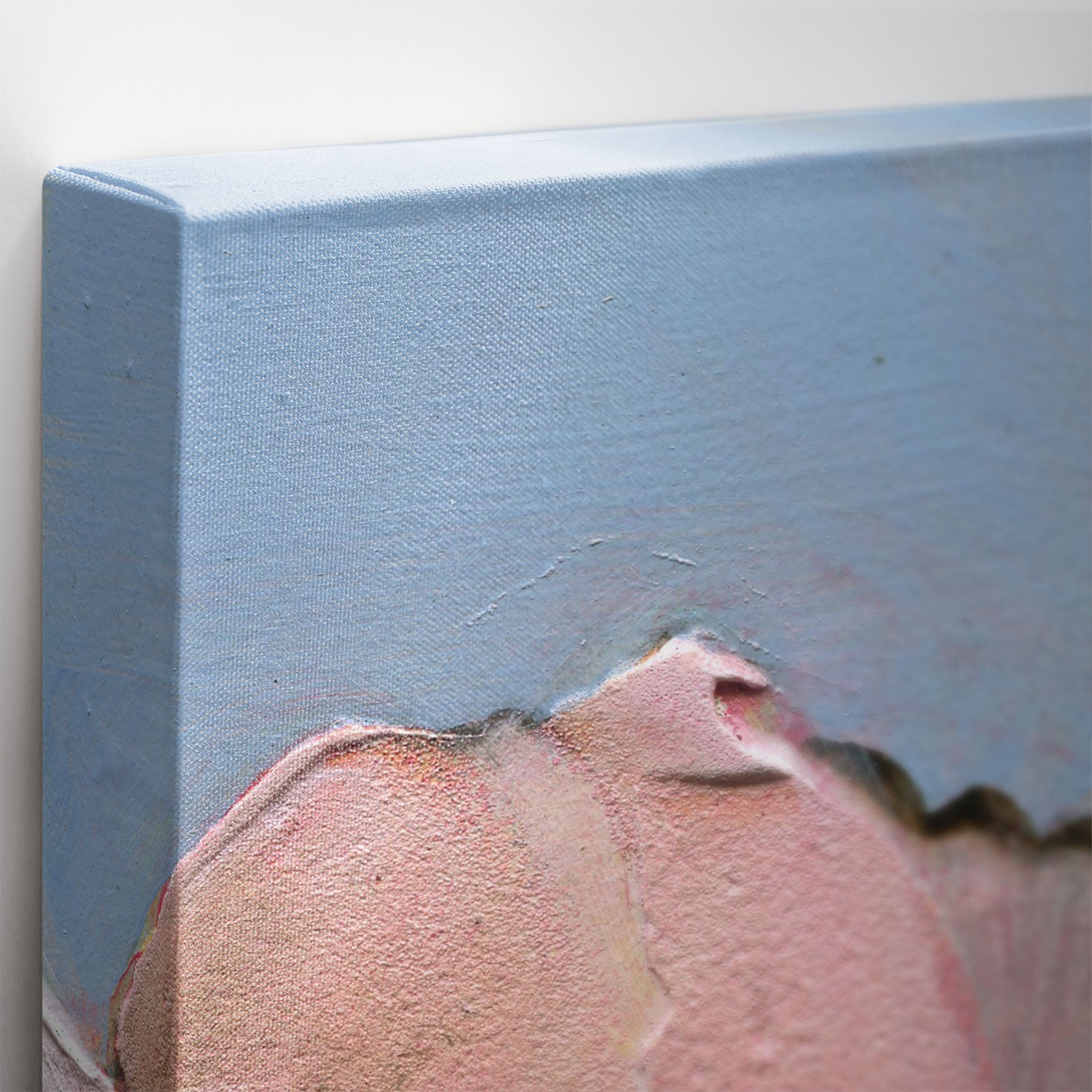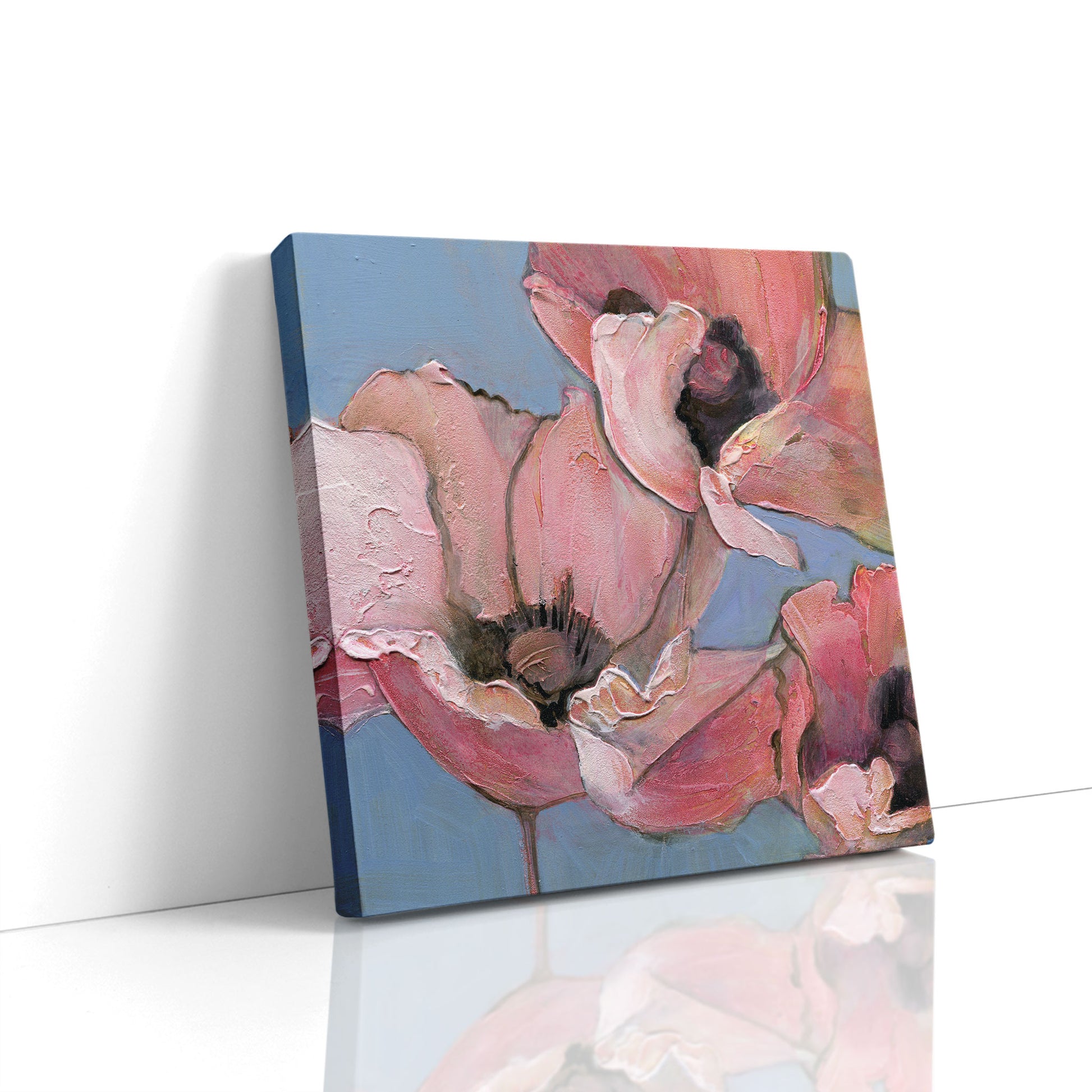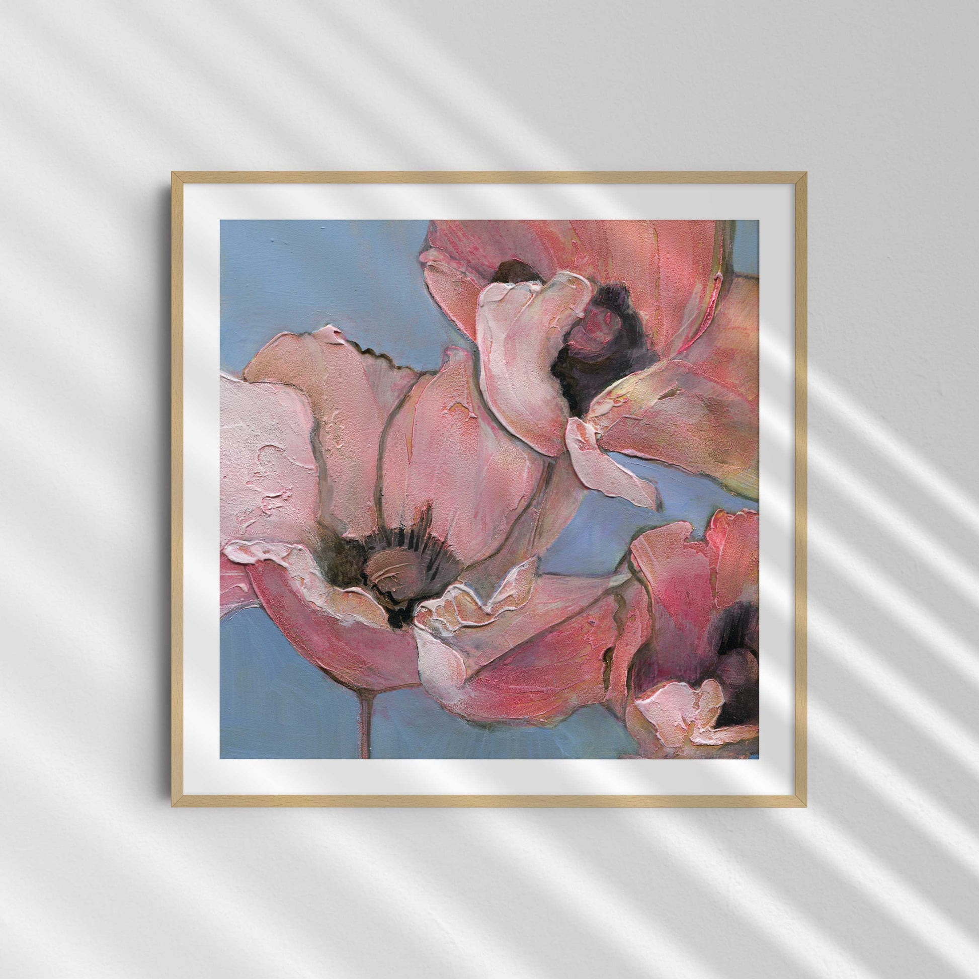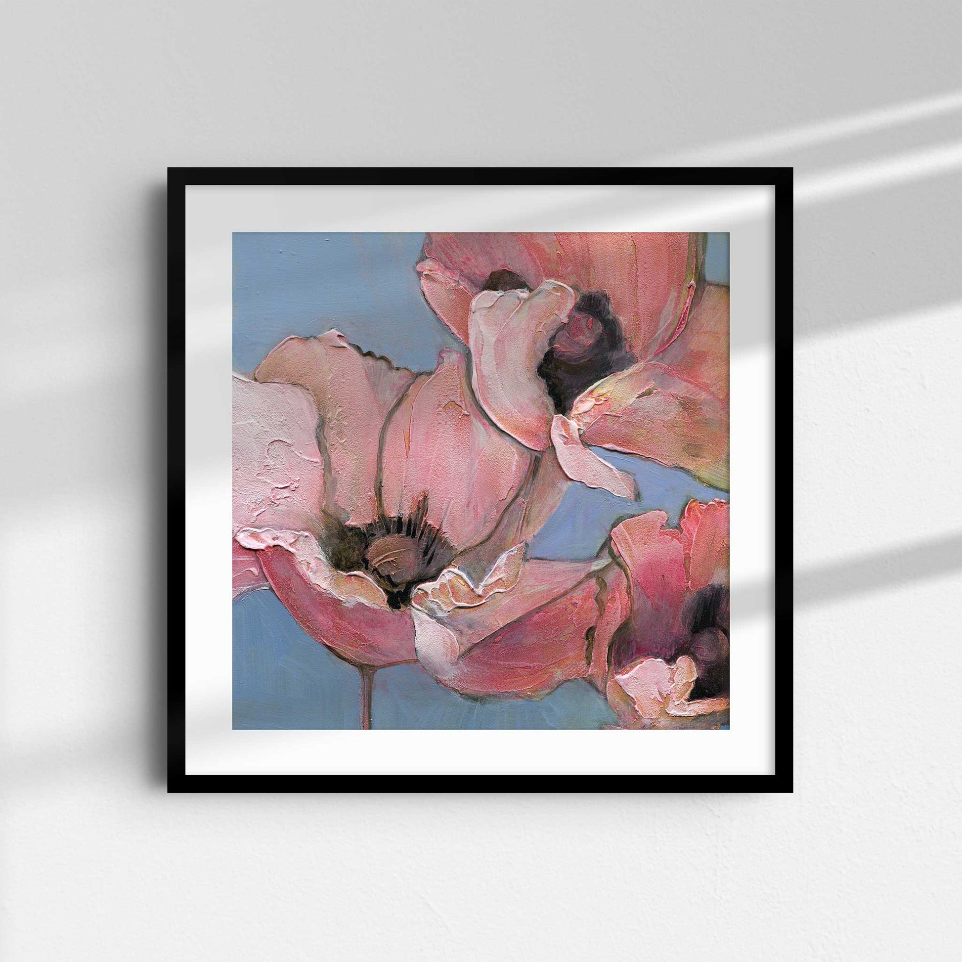 Introduce softness and elegance to your space with "Poppy Portrait I", the first in a six-part series of fine art prints from the original acrylic painting, Six Poppy Portrait. This close-up features pink poppies with textured petals, set against a light blue background. Gentle brushstrokes and subtle color blending give the piece a serene, delicate, and peaceful quality, perfect for creating a calming atmosphere.