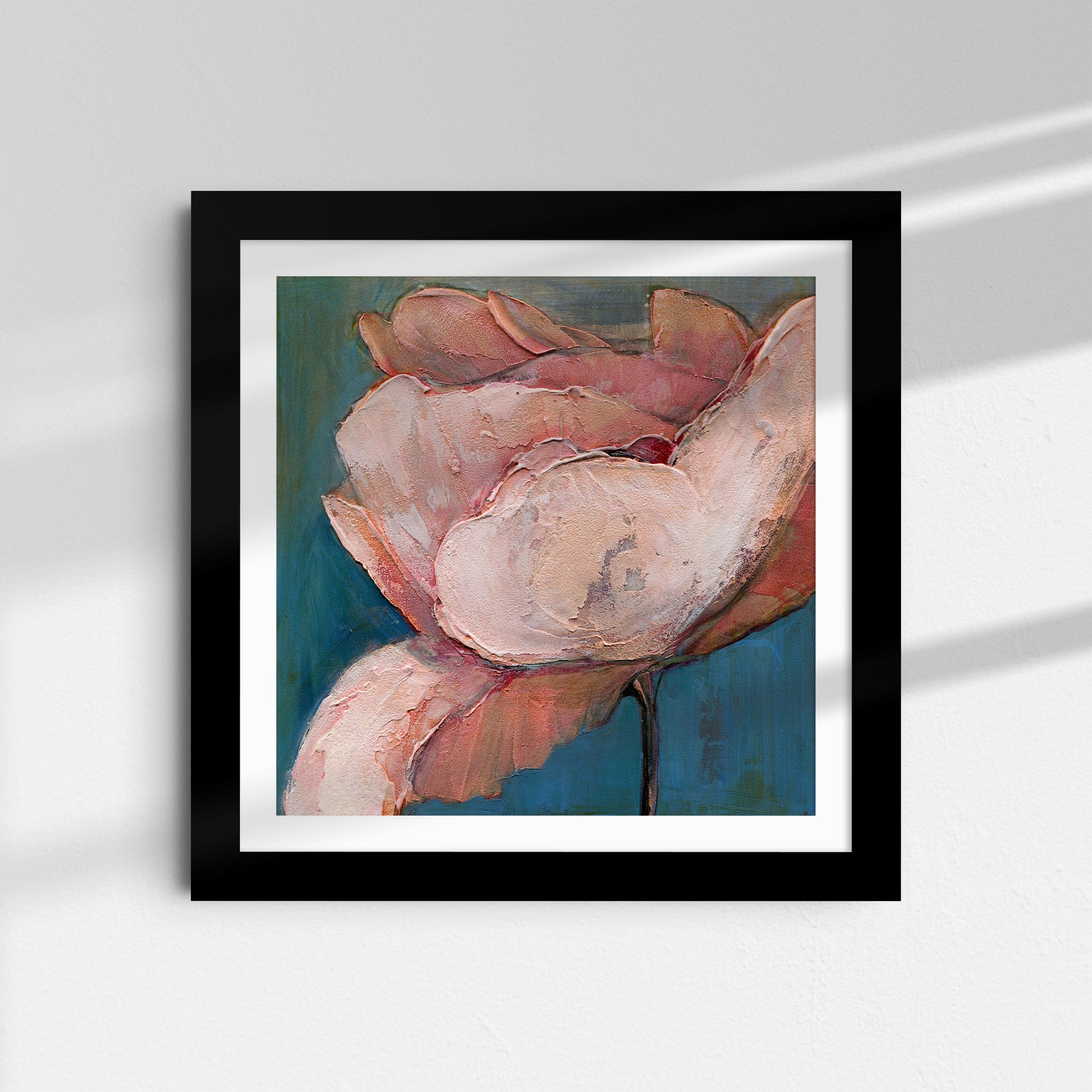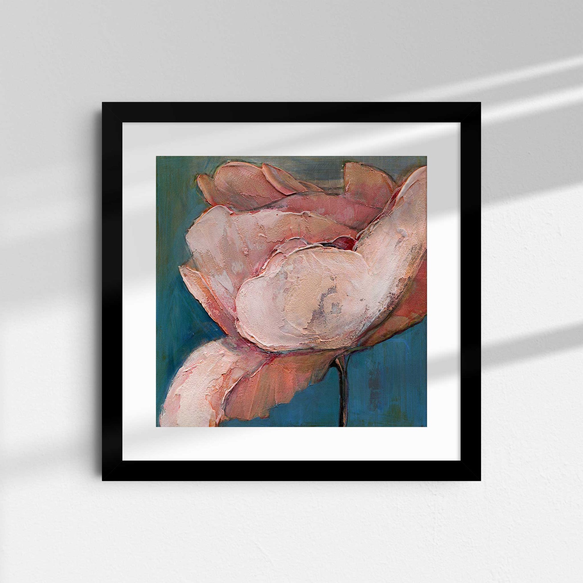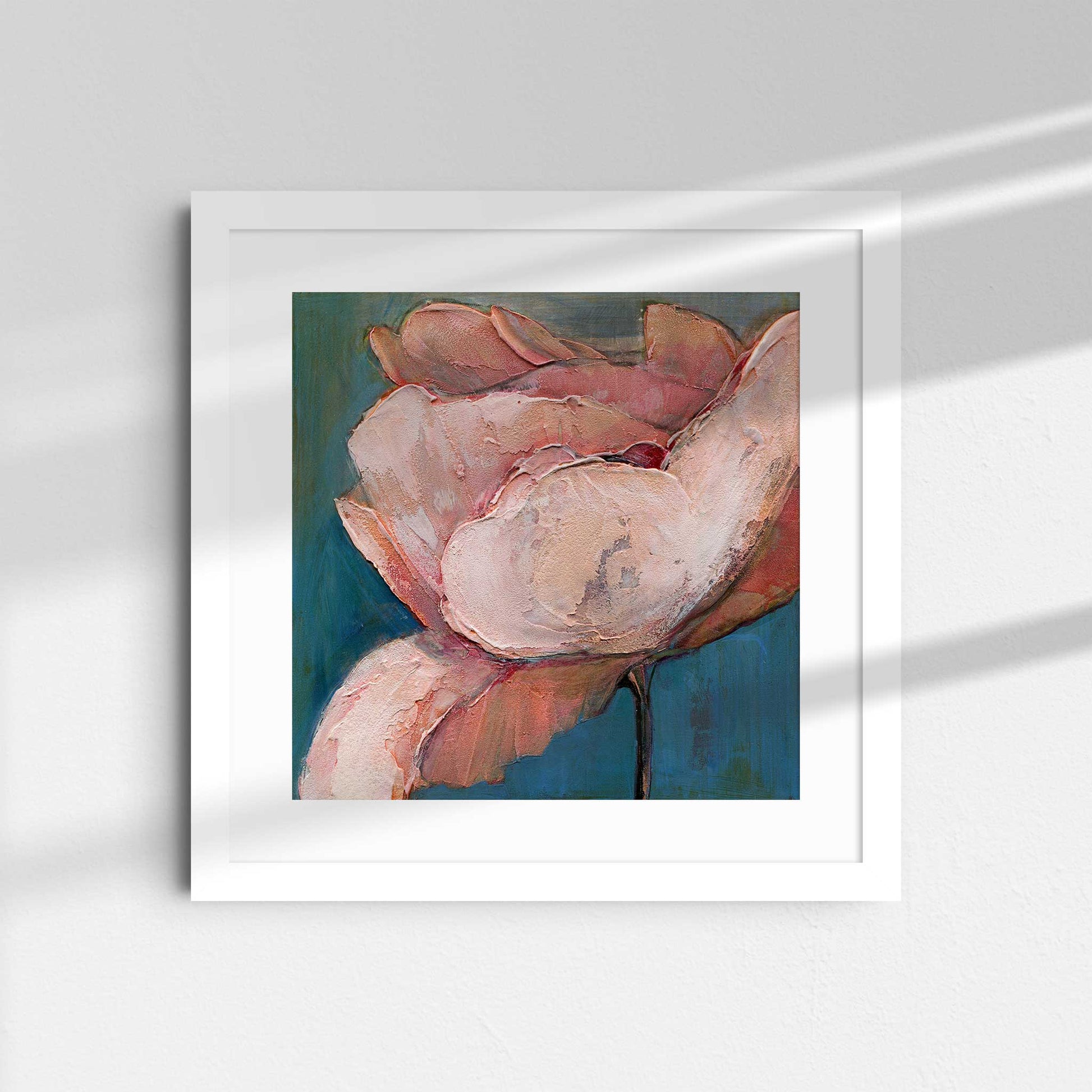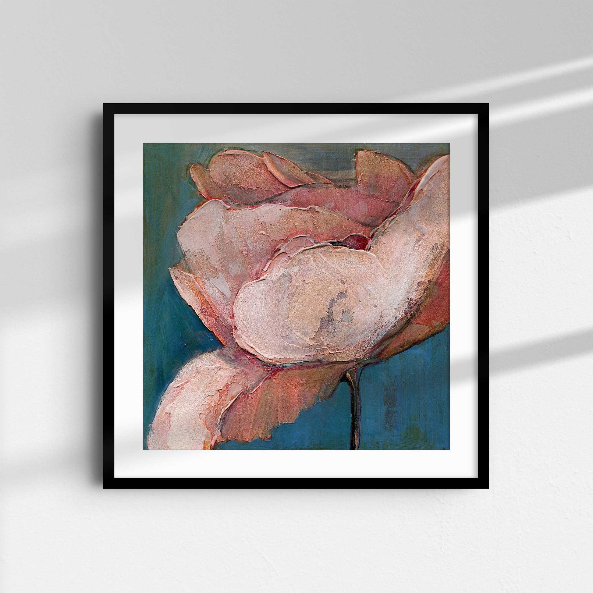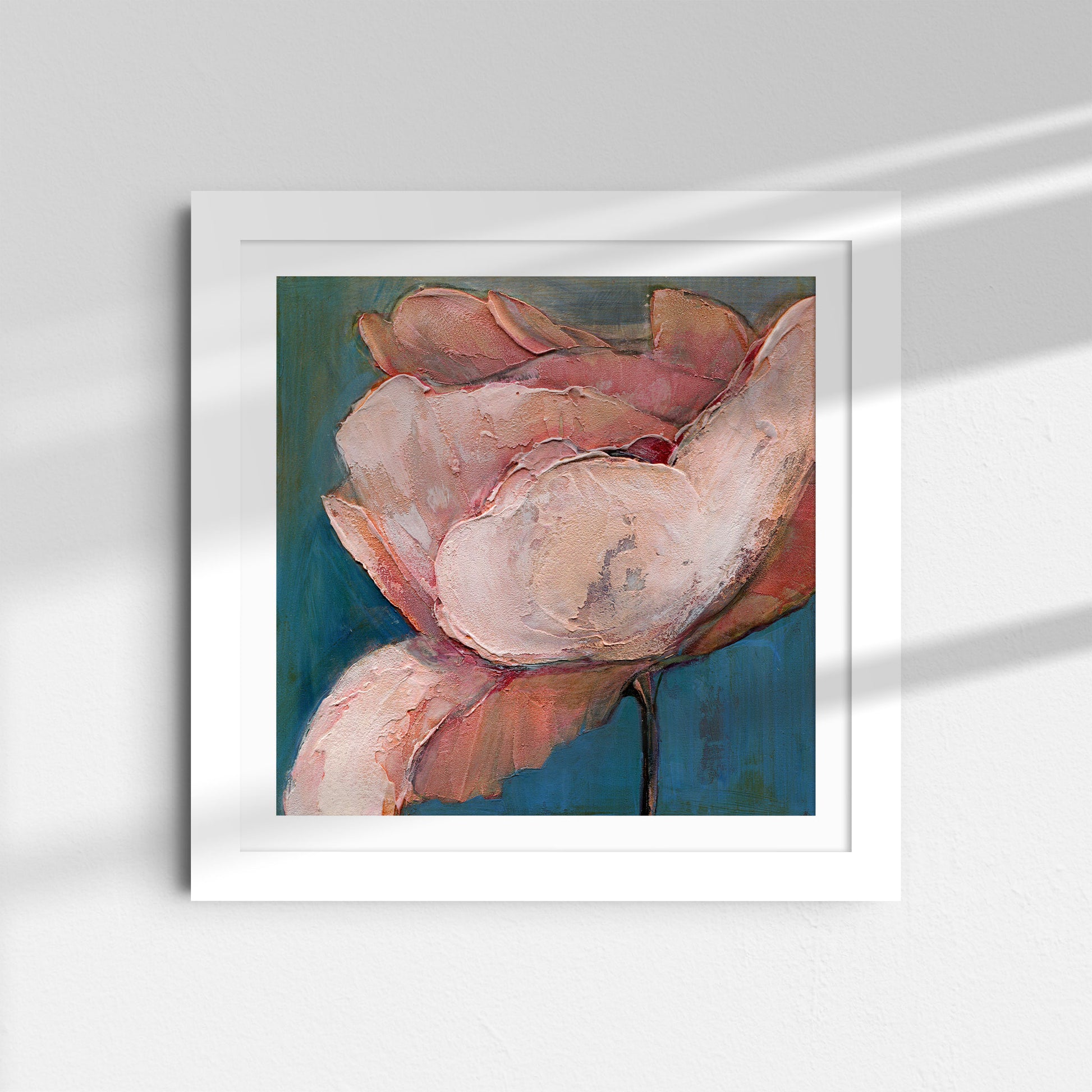 Discover quiet beauty in "Poppy Portrait II", the second print in the six-part series from the original acrylic painting, Six Poppy Portrait. This artwork offers an abstract close-up of poppy petals in soft pink and peach tones, set against a muted teal background. Light, layered brushstrokes create a sense of movement, texture, and gentle elegance, making this piece both calming and expressive.