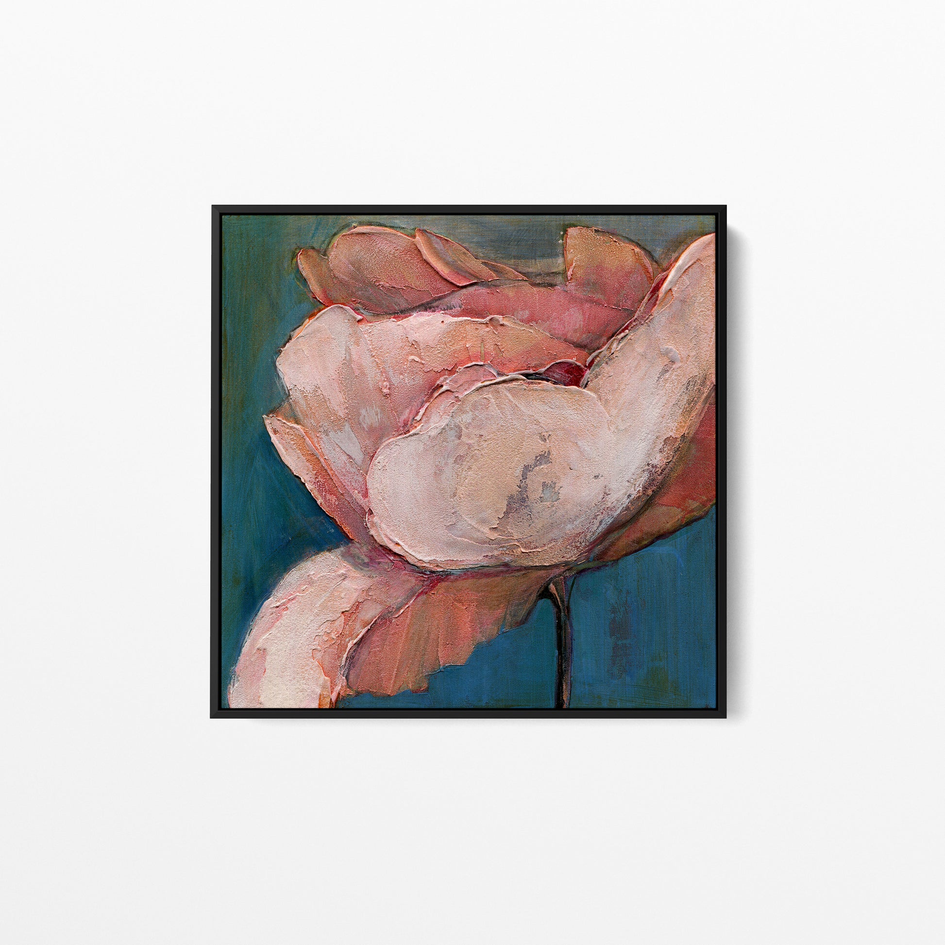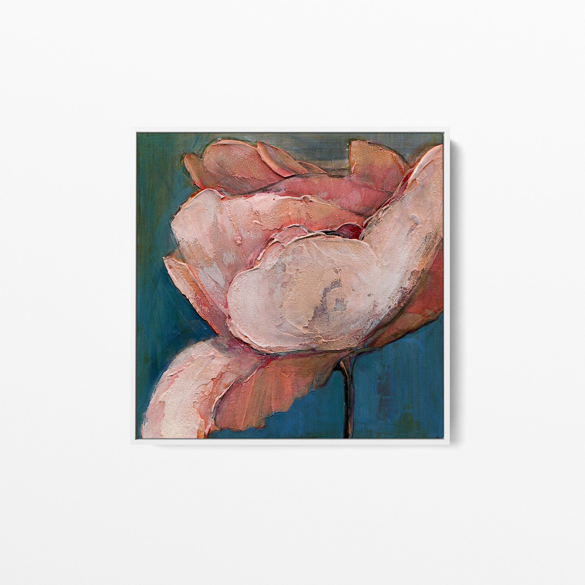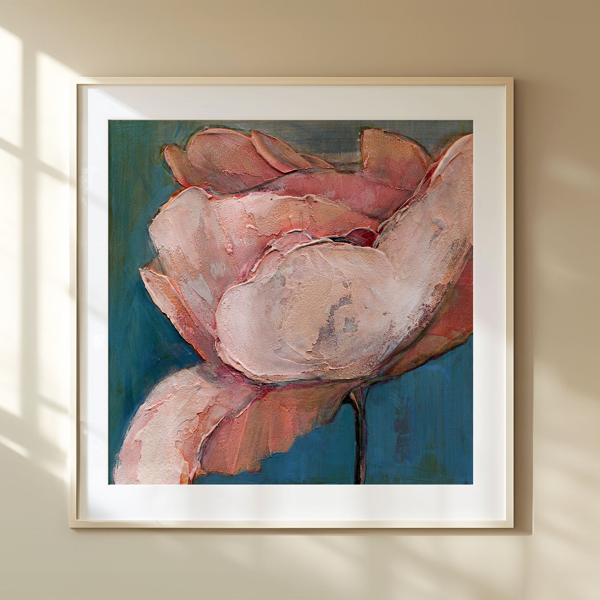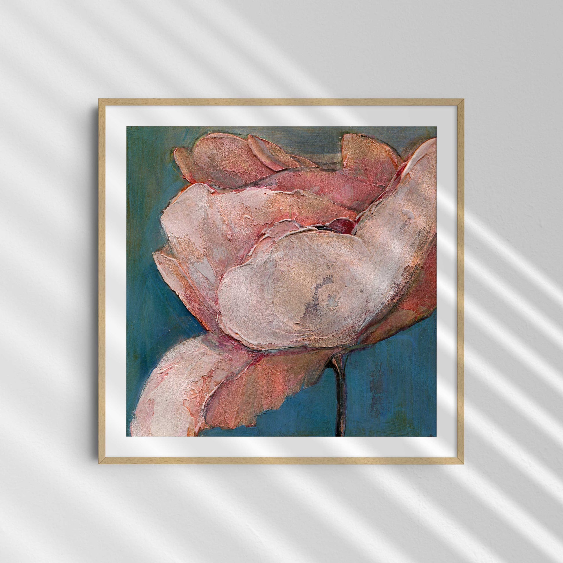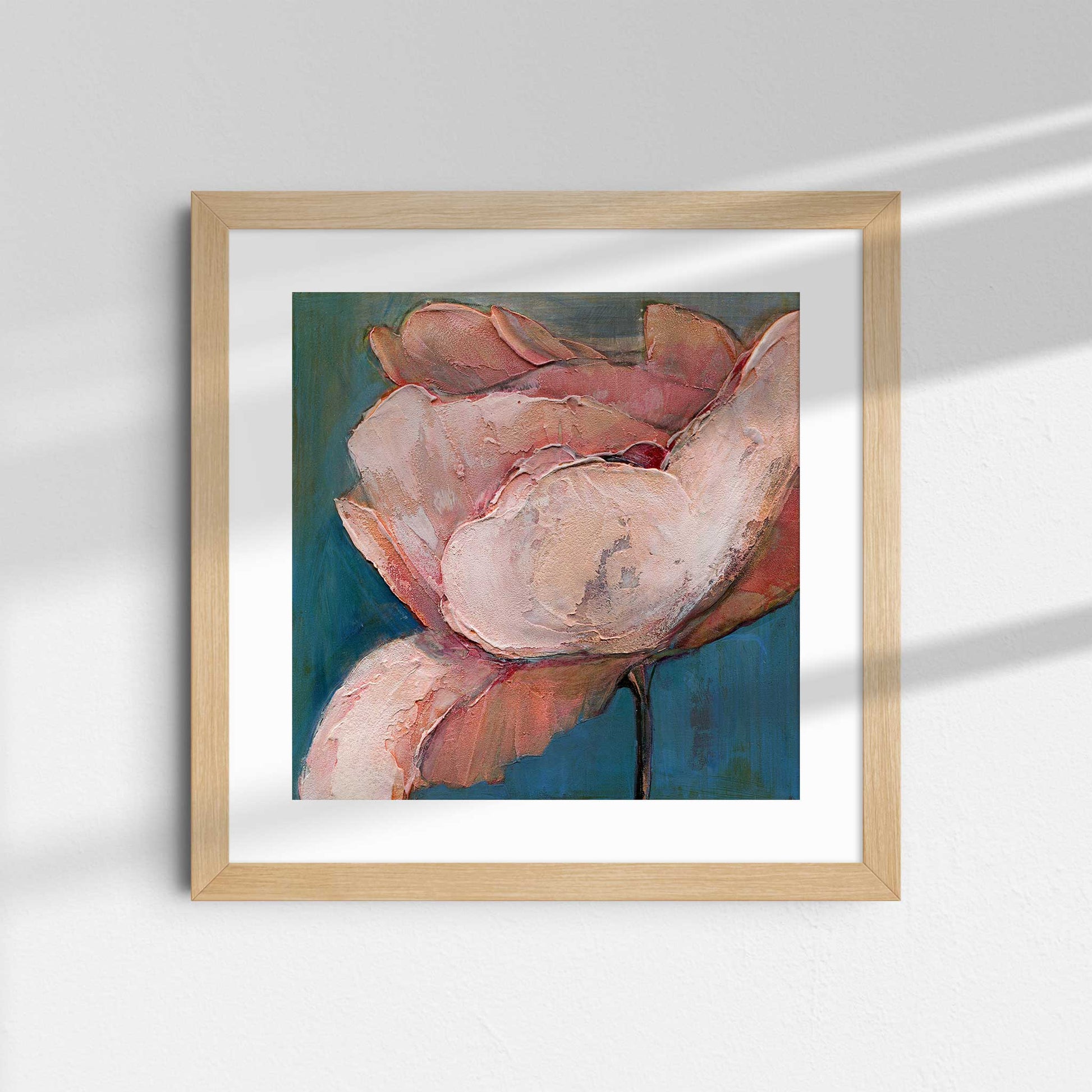 Discover quiet beauty in "Poppy Portrait II", the second print in the six-part series from the original acrylic painting, Six Poppy Portrait. This artwork offers an abstract close-up of poppy petals in soft pink and peach tones, set against a muted teal background. Light, layered brushstrokes create a sense of movement, texture, and gentle elegance, making this piece both calming and expressive.
