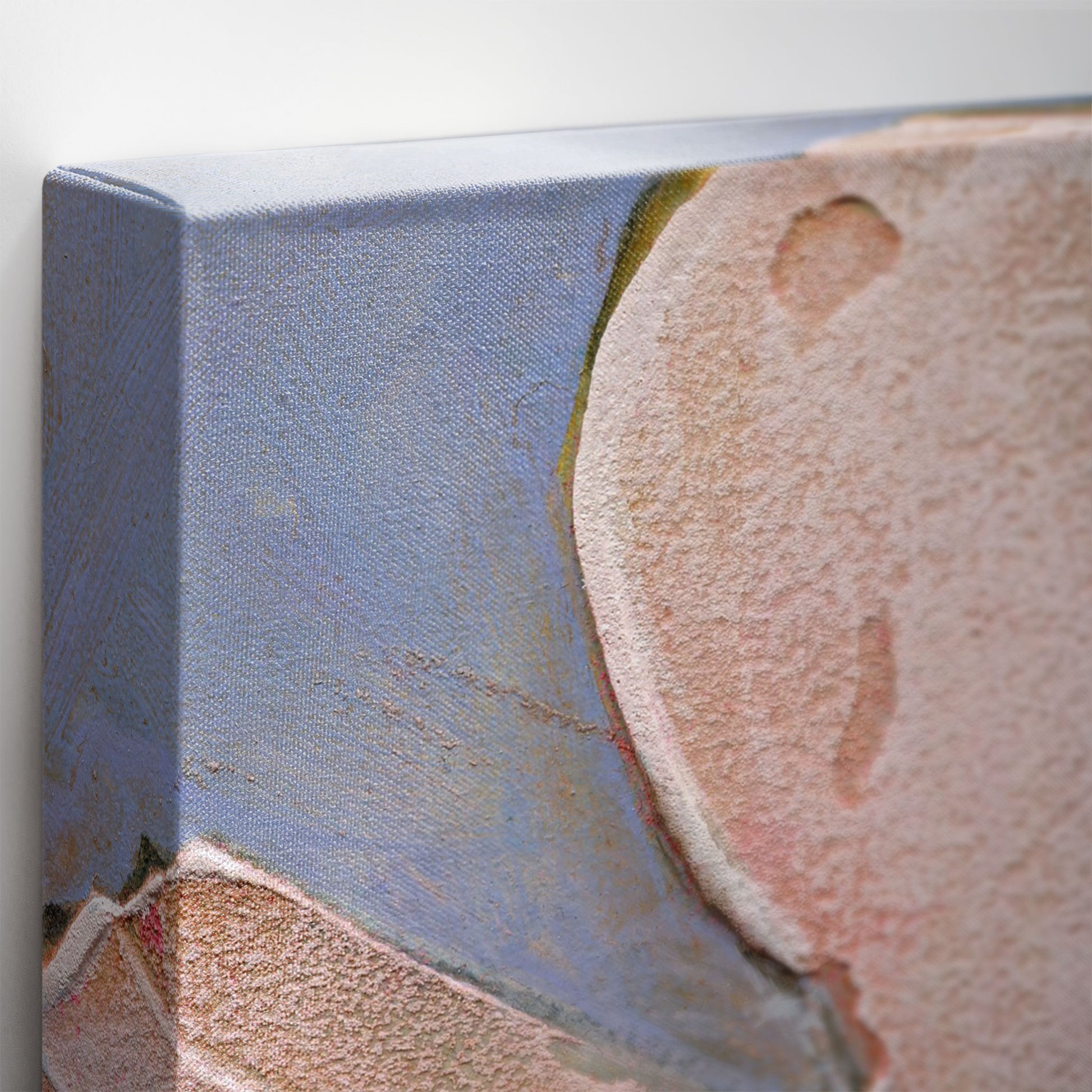 Invite calm and beauty into your space with "Poppy Portrait IV", the fourth piece in the six-part series from the original acrylic painting, Six Poppy Portrait. This abstract floral print features delicate pink and peach poppies set against a richly textured blue background. The softly layered petals and balanced composition create a serene, airy atmosphere, perfect for interiors that prioritize peace and elegance.