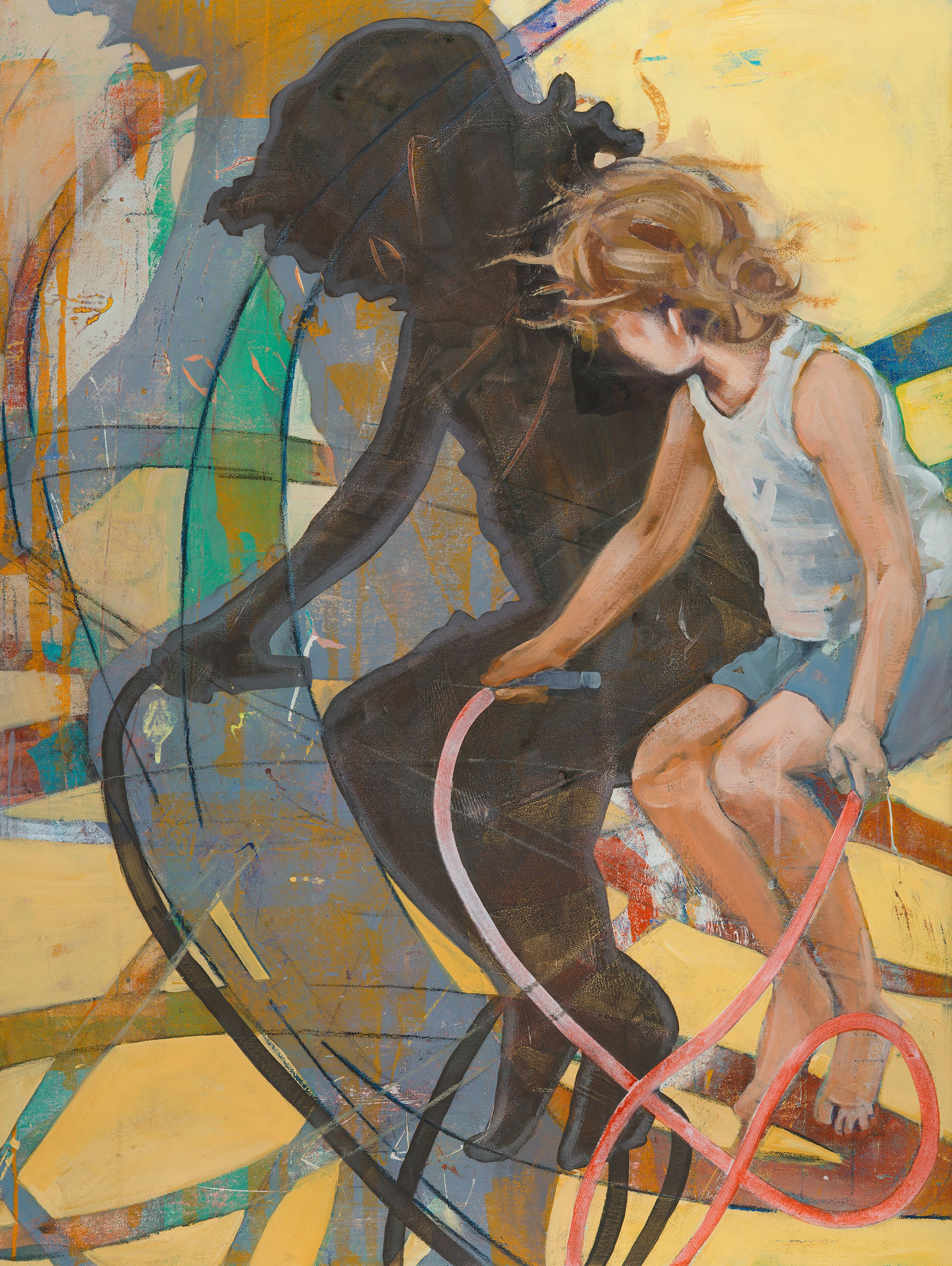 "Tangled" is an original acrylic painting from my Educated Hoops series. A young girl in a white tank top and shorts plays with a jump rope, her body mid-motion as she casts a large shadow across a colorful, abstract background. Lines loop and twist through the composition, creating the sense of a playful but intricate world—one full of motion, emotion, and layered meaning. The scene feels alive, imaginative, and just a little chaotic, as childhood often is.